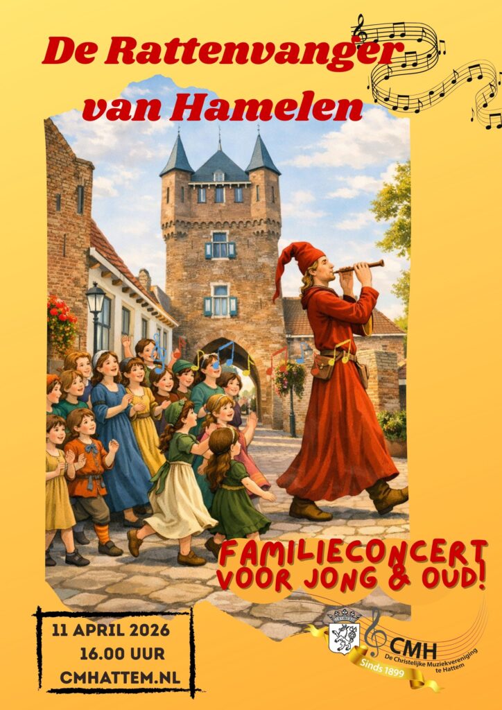 Op zaterdag 11 april verandert De Open Poort in Hattem in het decor van een bijzonder muzikaal verhaal. Tijdens dit familieconcert, dat om 16.00 uur begint, nemen we jong én oud mee in de betoverende wereld van De Rattenvanger van Hamelen.